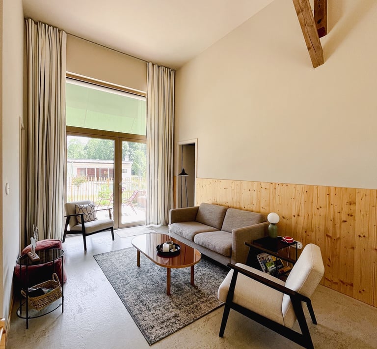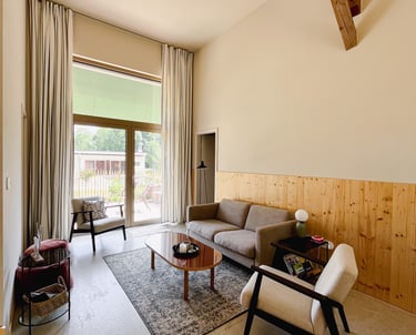 Salon et coin repas : Espace cosy avec un canapé confortable et une table pour deux